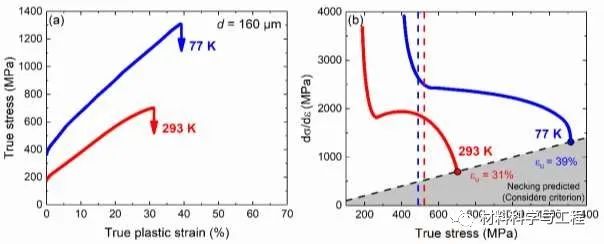 圖4 (a)在平均晶粒尺寸d=160μm的情況下,在77K和293K進(jìn)行拉伸時(shí)的真應(yīng)力-真塑性應(yīng)變曲線;(b)在與(a)相同的溫度下,加工硬化率dσ/dε作為真實(shí)應(yīng)力的函數(shù)
