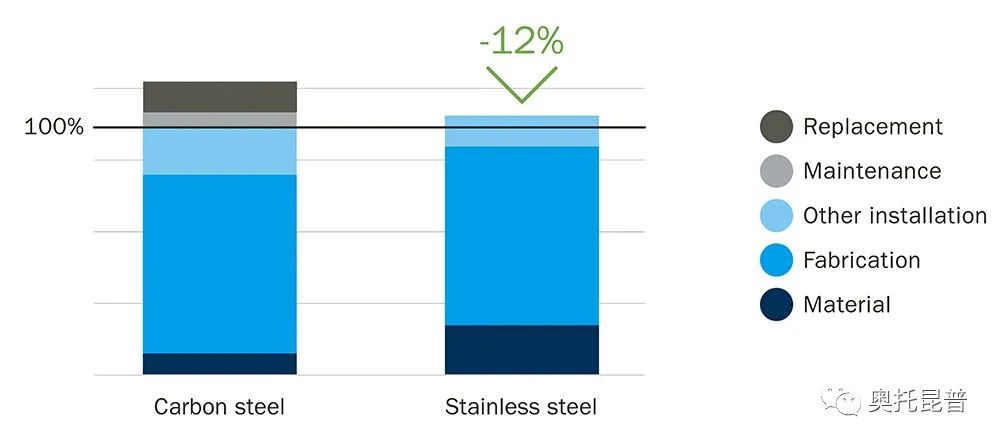 在選擇用于公交客車結(jié)構(gòu)的材料時(shí),重要的是要在計(jì)算其初始購買成本的同時(shí),并考慮整個(gè)生命周期內(nèi)的使用維護(hù)成本對總成本的影響。根據(jù)國際不銹鋼論壇ISSF的分析,使用不銹鋼可以將車體框架的總生命周期成本降低12%,見圖1。