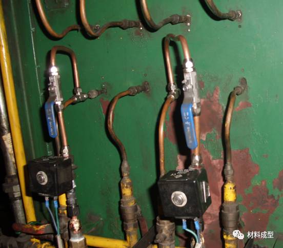 我公司現(xiàn)有五套轉(zhuǎn)體爐成套壓淬設(shè)備,最早配備的兩套轉(zhuǎn)體爐成套壓淬設(shè)備其轉(zhuǎn)體加熱爐的保護氣氛采用的是滴注甲醇+丙酮的混合形式,與先期使用的L20型滲碳連續(xù)生產(chǎn)線的氣氛控制方式相同。我們曾提過合理的調(diào)整丙酮與甲醇的流量能夠起到了減少炭黑的形成。但對于轉(zhuǎn)體爐來講,因為轉(zhuǎn)體爐工作時節(jié)拍較快,即爐門的開關(guān)頻繁,開門時爐內(nèi)的碳勢下降的很快,關(guān)門后要有較大流量的滴入丙酮才能恢復碳勢。但當人們調(diào)整工件時,爐門關(guān)閉等待的時間又較長,只需很小的流量就能維持住碳勢。職工來回頻繁的調(diào)節(jié)流量不具有操作性。所以該設(shè)備使用初期生成的炭黑很多,每半年我們都要進行一次徹底燒炭,持續(xù)一天。后來我們效仿其他后購進設(shè)備設(shè)計將丙酮的流量改為自動控制(圖5a、圖5b)。方法比較簡單,只是利用碳控儀表,通過中間繼電器間接驅(qū)動電磁閥控制丙酮了流量,這樣當爐內(nèi)碳勢達到一定范圍時會停止丙酮的滴注,炭黑明顯減少,兩臺設(shè)備單此一項每月能為公司節(jié)約一萬余元的消耗。