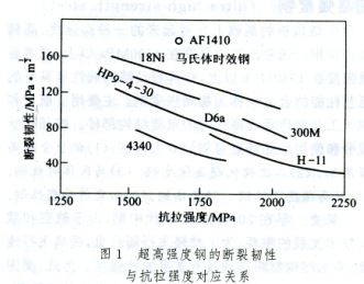 鋼的斷裂韌性取決于鋼的化學(xué)成分、顯微組織和冶金質(zhì)量。圖1為幾種超高強度鋼的斷裂韌性與抗拉強度的對應(yīng)關(guān)系??梢钥闯觯我环N鋼的斷裂韌性均隨抗拉強度升高而降低。在等強度條件下,馬氏體時效鋼的斷裂韌性高于低合金超高強度鋼,而AFl410鋼的斷裂韌性最高。