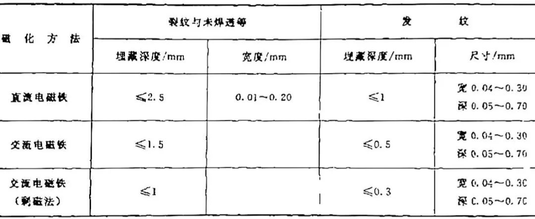 磁粉檢測靈敏度取決于磁化方法與規(guī)范、磁粉或磁懸浮液的性質(zhì)、被檢物材料特性及缺陷的位置等。一些磁化方法可達(dá)到的靈敏度見表2 。