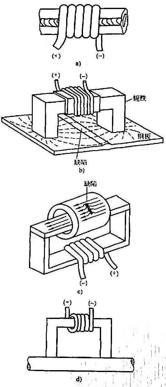d)線圈法  e)電磁鐵法  f)磁軛法