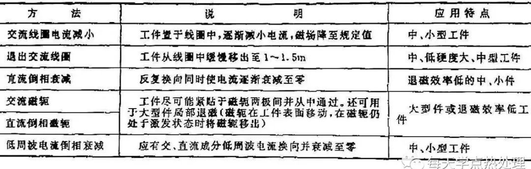 檢測過程中,若有前次磁化的殘留剩磁可能會影響磁痕痕跡。因此,在兩次連續(xù)操作之間應(yīng)對被檢工件做退磁處理。檢測后不允許有剩磁的被檢物也必須退磁處理。退磁法方法列于表5。