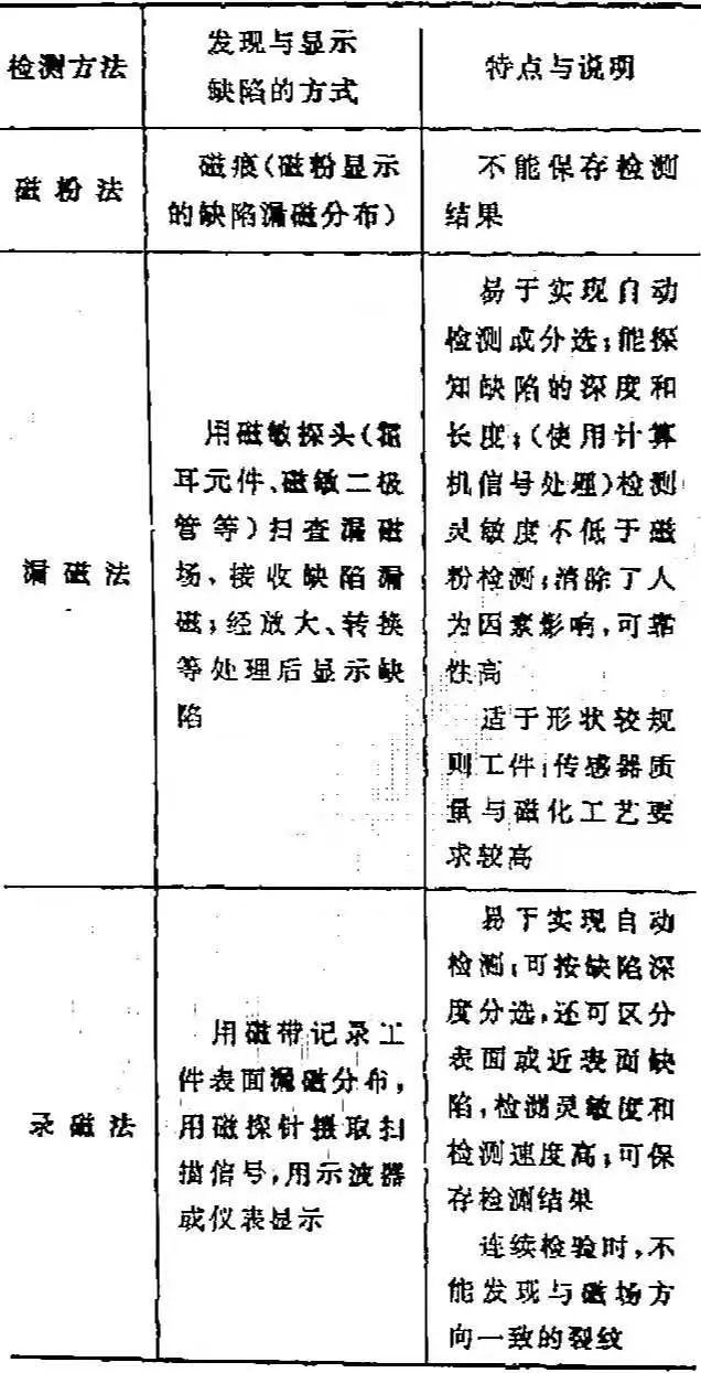 漏磁檢測、錄磁檢測與磁粉檢測原理相同,均為利用被檢物本身與缺陷的變化來檢測缺陷。磁粉檢測、漏磁檢測及錄磁檢測各自的特點(diǎn)見表9 。