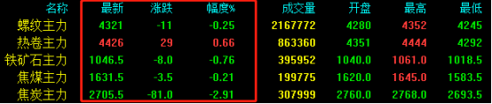 期鋼早盤一度翻紅,午后收盤走勢(shì)分化。期螺下跌11收?qǐng)?bào)4321,期卷上漲29收?qǐng)?bào)4426,鐵礦石下跌8收?qǐng)?bào)1046.5,焦煤下跌3.5收?qǐng)?bào)1631.5,焦炭下跌81收?qǐng)?bào)2705.5。