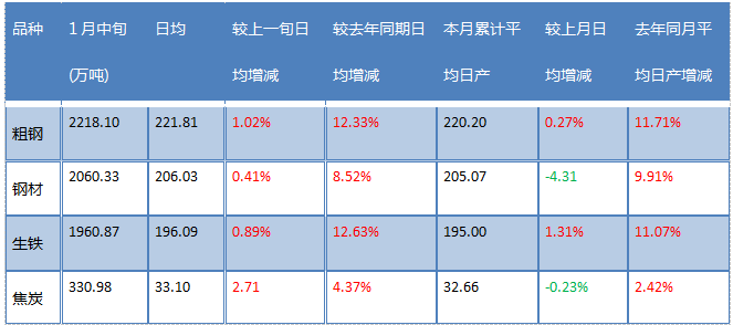 1、中鋼協(xié):1月中旬重點(diǎn)鋼企粗鋼日均產(chǎn)量221.81萬(wàn)噸