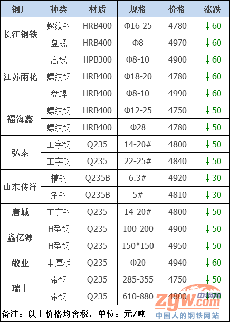 據(jù)數(shù)據(jù)監(jiān)測,今日共20家鋼廠調價,其中跌幅最大為瑞豐帶鋼,調價幅度70元/噸,具體調價明細如下: