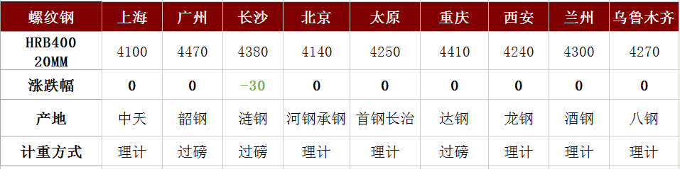 今日全國25個(gè)主要城市螺紋鋼價(jià)格窄幅震蕩。其中,武漢、成都2個(gè)城市螺紋鋼價(jià)格上漲10元/噸,福州、南昌、長沙等3個(gè)城市螺紋鋼價(jià)格下跌30元/噸,多數(shù)城市持穩(wěn)運(yùn)行。
