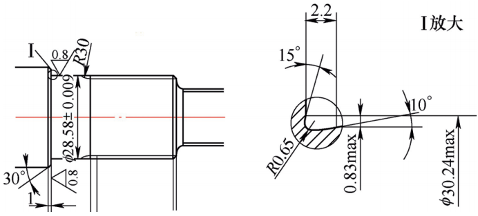 齒輪軸類零件設(shè)計(jì)有卡簧槽,由于使用的刀具不是成形刀,造成卡簧槽加工缺陷;或軸類零件滲碳淬火后變形太大,在滲碳淬火后校直壓傷,使用過程中造成斷裂,如圖3、圖4所示。