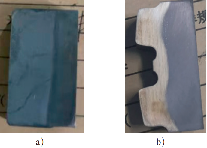 2)齒輪感應(yīng)淬火后先對(duì)齒輪進(jìn)行縱剖(見圖19a),檢測(cè)硬化層形狀,根據(jù)形狀對(duì)上下位置進(jìn)行調(diào)整;在齒輪圓周方向按照90°方向切割4塊,檢測(cè)硬化層均勻性(見圖19b)。對(duì)于齒輪上中下3個(gè)位置檢測(cè)硬化層及硬度的均勻性。
