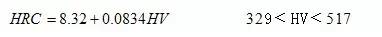 此公式用我國(guó)公布的黑色金屬硬度標(biāo)準(zhǔn)數(shù)據(jù)進(jìn)行換算,其HRC誤差基本上在±0.4HRC 范圍內(nèi),其最大誤差也僅士0.9HRC,計(jì)算的HV誤差最大為±15HV。