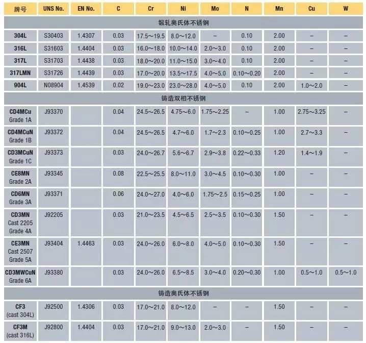 表1  鍛軋和鑄造雙相不銹鋼的化學(xué)成分*(重量%)
