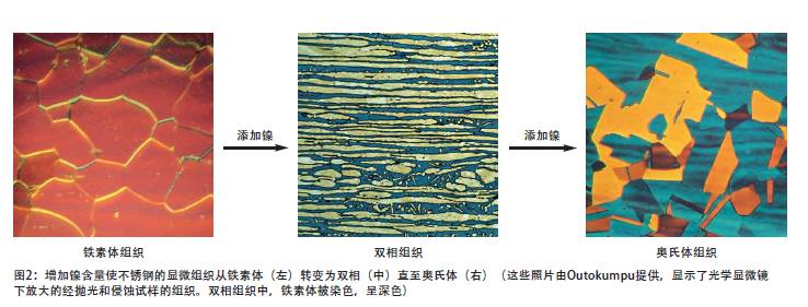 鎳是穩(wěn)定奧氏體的元素,鎳促使不銹鋼的晶體結(jié)構(gòu)從體心立方結(jié)構(gòu)(鐵素體)轉(zhuǎn)化為面心立方結(jié)構(gòu)(奧氏體)。鐵素體不銹鋼含極少的鎳或不含鎳,雙相不銹鋼含鎳量為低至中等,如1.5%~7%,300系奧氏體不銹鋼至少含有6%的鎳(見(jiàn)圖1、2)。添加鎳延緩了奧氏體不銹鋼中有害金屬間相的形成,但是在雙相不銹鋼中鎳的延緩作用遠(yuǎn)不如氮有效。面心立方結(jié)構(gòu)使得奧氏體不銹鋼具有極佳的韌性。雙相不銹鋼中有近一半是奧氏體組織,因此雙相鋼的韌性比鐵素體不銹鋼顯著提高。
