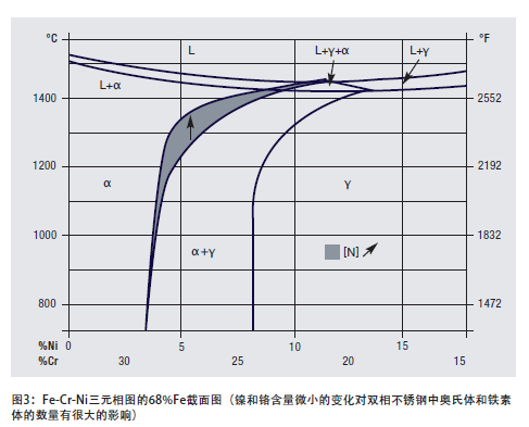 Fe-Cr-Ni合金三元相圖是雙相不銹鋼冶金行為的指路圖。從鐵含量為68%處的三元截面圖(圖3)可看出:這些合金以鐵素體(a)凝固,當(dāng)溫度下降至1000℃(1832℉)左右時(shí),部分鐵素體轉(zhuǎn)變成奧氏體(g)(取決于合金成分)。在更低溫度下,處于平衡態(tài)的鐵素體和奧氏體幾乎沒(méi)有進(jìn)一步的改變。從圖3還可看出增加氮的影響。從熱力學(xué)觀點(diǎn)看,因奧氏體是由鐵素體轉(zhuǎn)變而來(lái)的,合金不可能跳過(guò)奧氏體的平衡態(tài)。然而,當(dāng)繼續(xù)冷卻至較低溫度時(shí),碳化物、氮化物、σ相以及其他金屬間相都可能成為顯微組織的成分。