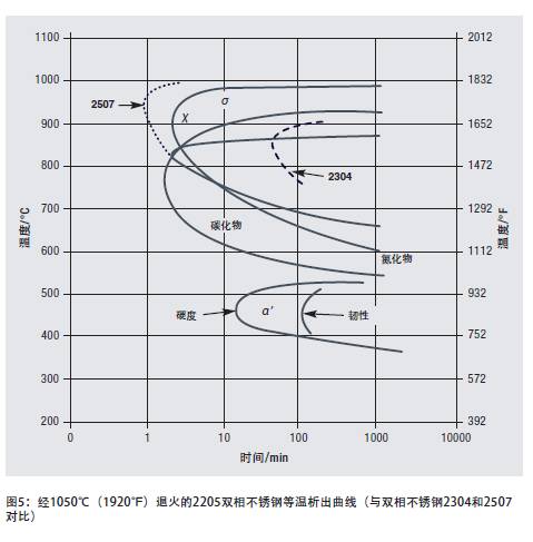 σ相和χ相析出的溫度略高但是與碳化物和氮化物析出的時(shí)間大致相同。鉻、鉬和鎳含量更高的雙相不銹鋼牌號(hào)的σ相和χ相析出比2205更快;低合金化牌號(hào)析出則較慢。圖5中的虛線說(shuō)明σ相和χ相在較高合金化的2507中開(kāi)始形成的時(shí)間較早,而在2304中開(kāi)始時(shí)間較晚。