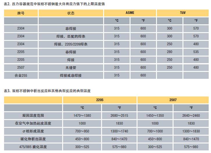 壓力容器設(shè)計(jì)規(guī)范中規(guī)定的各種雙相不銹鋼的溫度限值見(jiàn)表2。