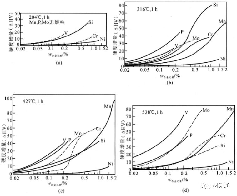 圖1 幾種常見合金元素對(duì)Wc = 0.2%鋼在不同溫度回火后引起的硬度增量(ΔHV)