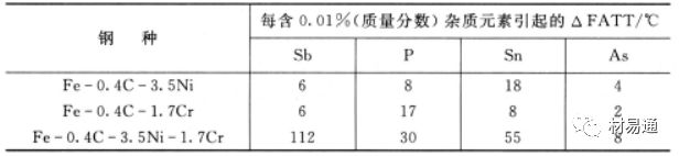2)促脆元素,如磷、錫、銻、砷、硫、硼等。這類元素要引起回火脆性,必須以存在致脆元素為前提。例如碳鋼中雖含有以上某些雜質(zhì),卻不存在回火脆性。從試驗(yàn)數(shù)據(jù)看,銻、錫、磷是影響最大的雜質(zhì)元素,其余的影響較小。一般來說,如果雜質(zhì)質(zhì)量分?jǐn)?shù)在10-5數(shù)量級(jí),影響較小;但如果雜質(zhì)質(zhì)量分?jǐn)?shù)在10-4以上,往往會(huì)引起明顯的回火脆性。表1和表2都是說明雜質(zhì)元素引起回火脆性的實(shí)例。