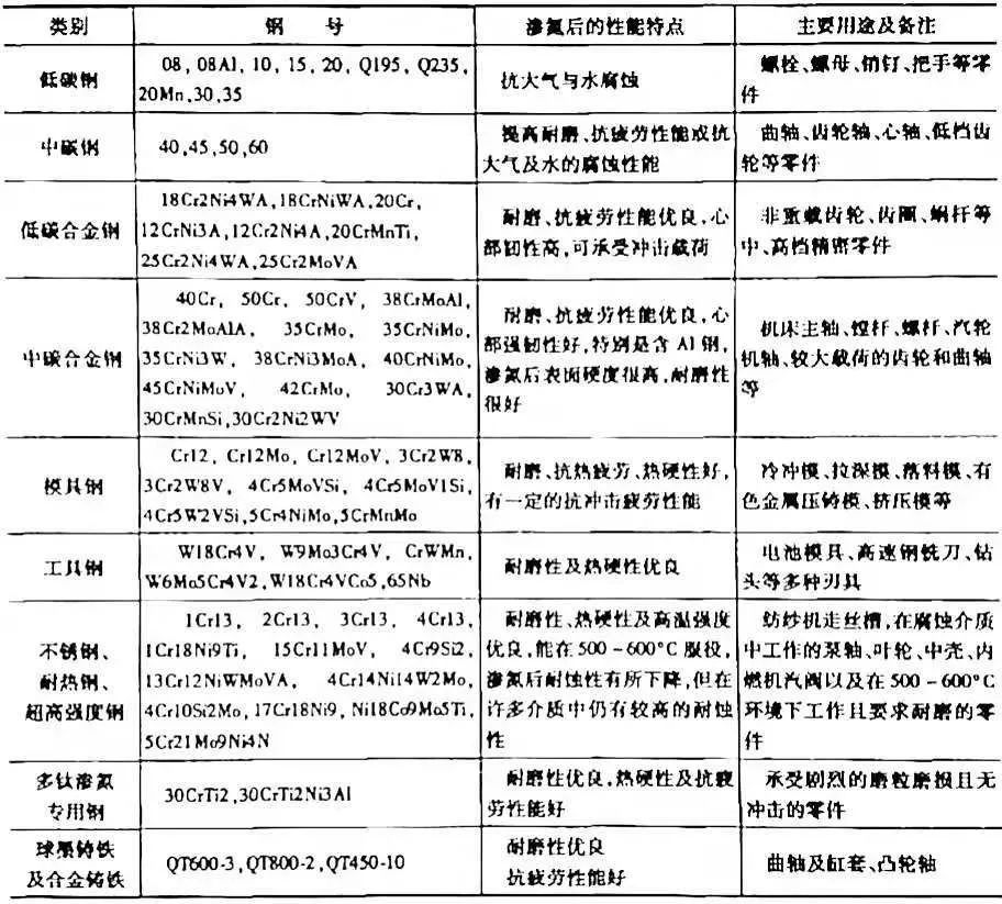 滲氮對(duì)材料的適應(yīng)面非常廣,一般的鋼鐵材料和部分非鐵金屬,如鈦及鈦合金等,均可進(jìn)行滲氮及多元共滲處理。以滲氮為主的多元共滲用鋼與滲氮用鋼是一致的。