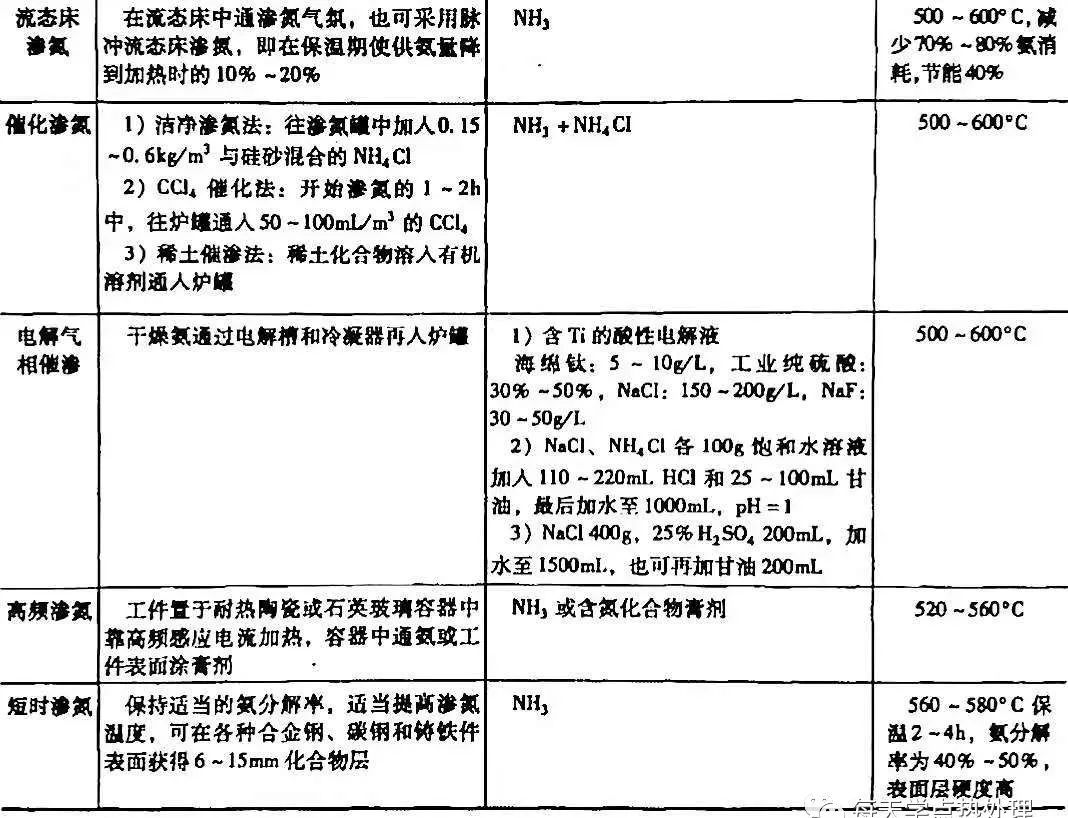 除氣體滲氮方法外,還有固體滲氮、鹽浴滲氮、真空脈沖滲氮、加壓滲氮、流態(tài)床滲氮、催化滲氮、電解氣相滲氮、高頻滲氮、短時(shí)滲氮等各種因地制宜的滲氮方法。詳見表12 。