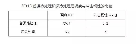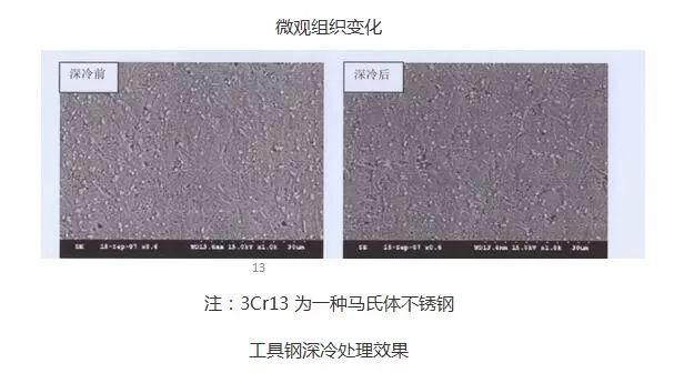 通過(guò)深冷處理使金屬內(nèi)大部分殘余奧氏體轉(zhuǎn)變成高強(qiáng)度的馬氏體,并析出大量超細(xì)碳化物顆粒,可以使整個(gè)金屬的強(qiáng)度增加,耐磨性增加,韌性增加,穩(wěn)定性增加,壽命成倍增加。
