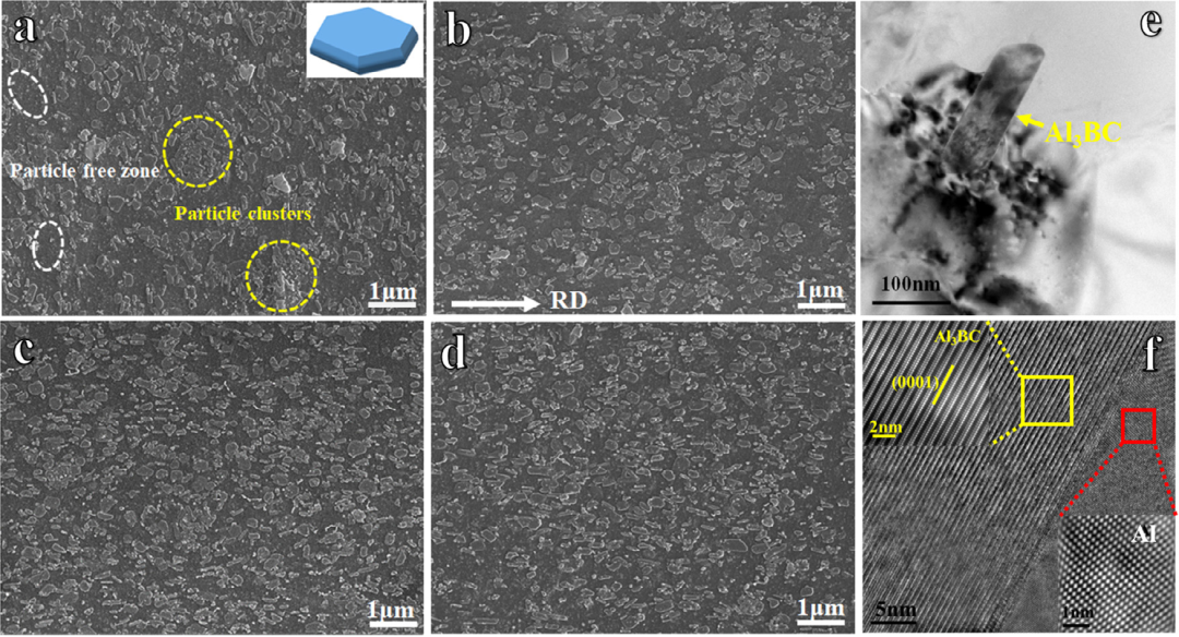圖1. Al3BC/6061復(fù)合材料的微觀結(jié)構(gòu)(RD-ND平面),顯示了Al3BC的分布和取向:(a)EXT,a所示為Al3BC的形態(tài);(b)HR80;(c)HR90;(d)HR95;(e)Al3BC的HRTEM圖像;(f)Al-Al3BC界面的典型晶格條紋圖像。插圖是(f)中標(biāo)記的紅色和黃色矩形的傅里葉濾波HRTEM圖像,顯示了Al矩陣和Al3BC的晶格條紋;(e)的插圖示出(f)的對應(yīng)的快速傅立葉變換(FFT),其指示Al3BC和α-Al的晶體取向關(guān)系。