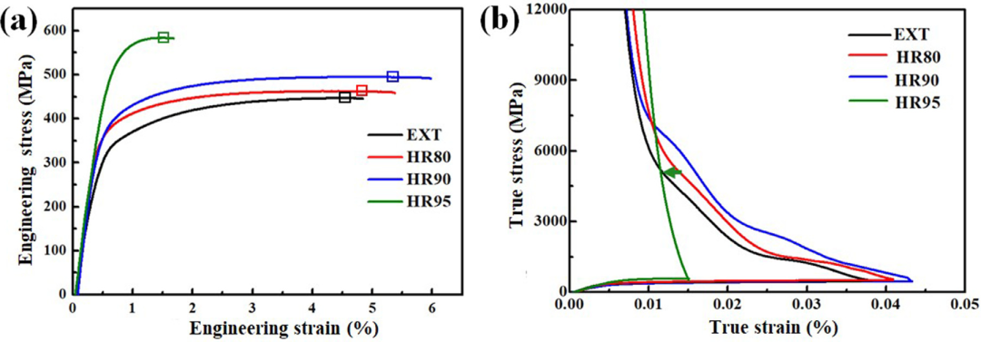 測得EXT試樣的屈服強(qiáng)度(YS)和極限抗拉強(qiáng)度(UTS)分別為~328 MPa和~447 MPa,相應(yīng)的均勻延伸率(UE)為~4.5%。從不同應(yīng)變條件下復(fù)合材料的拉伸工程應(yīng)力-應(yīng)變曲線(圖2a)可以看出,HR80和HR90試樣的YS、UTS和UE隨著應(yīng)變的增大而同時增大。還可以注意到,拉伸試驗(yàn)確定的彈性模量(E)從EXT試樣的72.9 GPa增加到HR90試樣的105 GPa。據(jù)我們所知,在鋁基復(fù)合材料中還未見過如此優(yōu)越的強(qiáng)度-韌性-剛度組合。