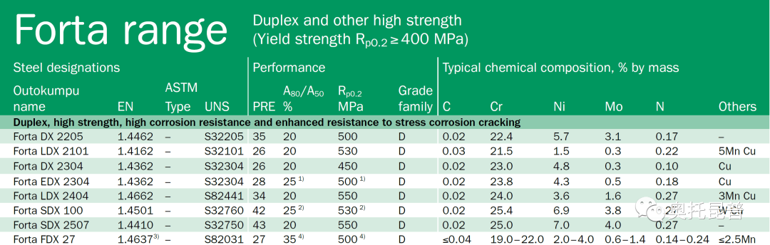 在這些低合金雙相鋼中,F(xiàn)orta LDX 2101尤其受歡迎。它具有較高的錳和氮,以彌補其較低的鎳含量。它具有高強度,良好的耐腐蝕性能和焊接性能。