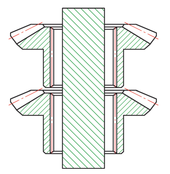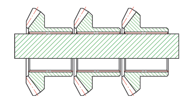 對(duì)于薄壁套類(lèi)或壁厚不均勻的零件,若采用橫擔(dān)串裝(見(jiàn)圖1)方式,會(huì)出現(xiàn)明顯的圓度,再加上零件的薄壁處相對(duì)于其他部位縮孔更為明顯,綜合起來(lái)變形就更為嚴(yán)重。