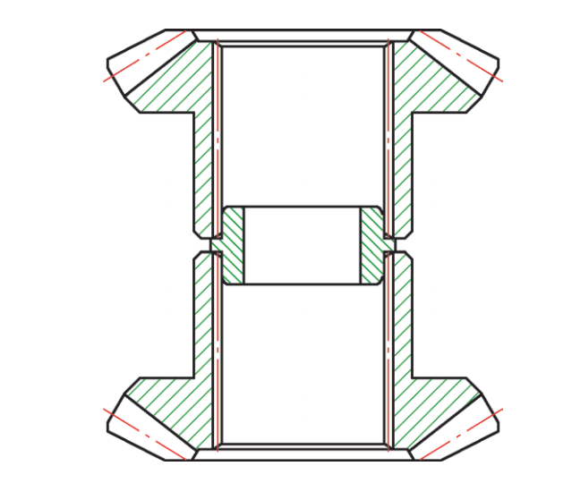 為減小更為復(fù)雜的變形,最好采用立式串裝(見(jiàn)圖2)或增添防變形套方式(見(jiàn)圖3),以減小熱處理變形,尤其是防變形套的運(yùn)用,若防變形套尺寸調(diào)整合適,即防變形套外徑與內(nèi)花鍵小徑預(yù)留間隙適當(dāng),熱處理后的零件幾乎沒(méi)有縮孔變形。