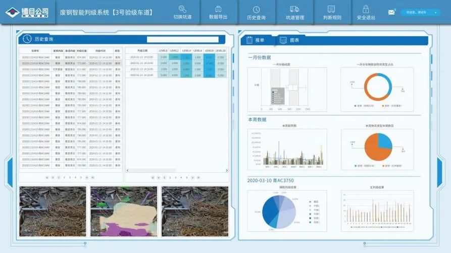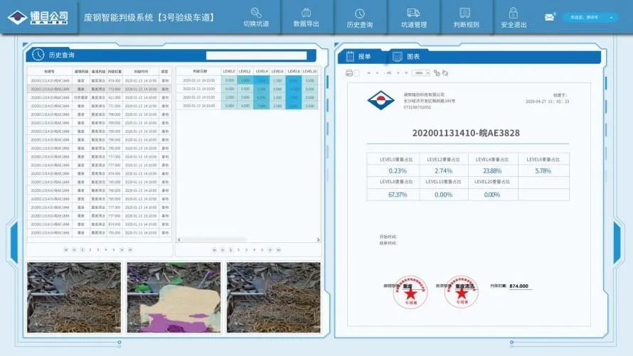 自動形成每車廢鋼的評級報表并打印。評級報表內容包含:車輛入場時間,車牌信息,合同號,卸車時長,廢鋼等級(包括各厚度廢鋼料型的占比),扣重扣雜信息等。