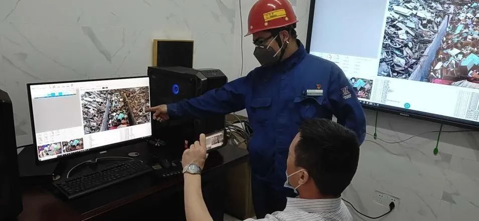 圖為新興鑄管驗級人員主動向前來考察的客戶介紹鐳目廢鋼智能評級系統(tǒng)。