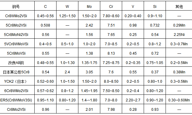 表1  常用的Cr8型鋼化學(xué)成分(質(zhì)量分?jǐn)?shù))              (%)