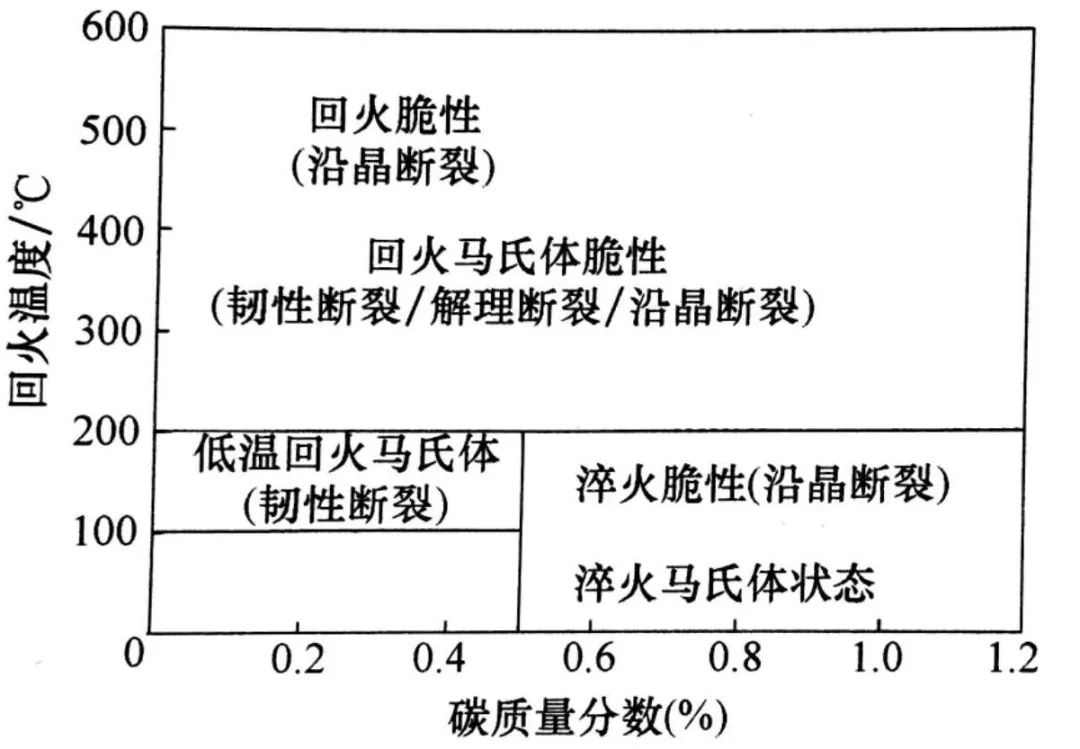 前已敘述,回火過程中的溫度是關(guān)鍵因素,因?yàn)殡S著回火溫度的提高,顯微組織的變化會(huì)加速。對(duì)于碳鋼和低合金鋼而言,格羅斯曼(Grossmann ) 和貝茵(Bain ) 給出五個(gè)實(shí)際溫度范圍,以便于討論回火過程。