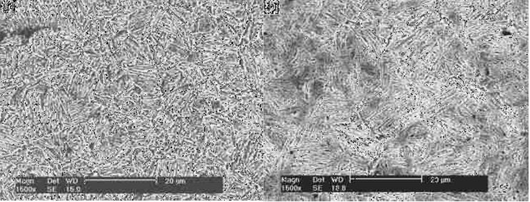 同時(shí),由中溫轉(zhuǎn)變過程的理論分析表明,要得到充分細(xì)化的中溫轉(zhuǎn)變組織(主要是貝氏體),首先要在母相中為相變提供更多的形核位置以增加形核率,更重要的是有效的限制新相的長(zhǎng)大,這是因?yàn)橹袦剞D(zhuǎn)變組織,特別是低碳類型鋼中的貝氏體,其長(zhǎng)大速度非???,如果不能對(duì)這種組織的長(zhǎng)大速度加以控制,則將會(huì)由一個(gè)先形核長(zhǎng)出的一片貝氏體迅速吞沒其鄰近的其它將要形核核心,從而不能得到充分細(xì)化的轉(zhuǎn)變組織。而30Si2MnCrMoVE鋼經(jīng)等溫退火后母相中不僅存在更多的形核位置同時(shí)保留了更多彌散分布的碳化物顆粒,這些碳化物顆粒在一定程度上對(duì)貝氏體的長(zhǎng)大起到了制約作用,從而使30Si2MnCrMoVE鋼經(jīng)等溫退火后的中溫轉(zhuǎn)變組織得到了充分細(xì)化。