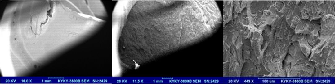 對斷裂軸全截面進行清洗,在低倍率下觀察其宏觀形貌,從宏觀上找出斷裂的撕裂紋走向,從而判斷其斷裂的最初起源點;對斷裂源進行電鏡、金相等分析,找出導致其斷裂失效原因;對斷裂全截面的硬度與顯微組織進行分析,從而對失效原因做出綜合分析。