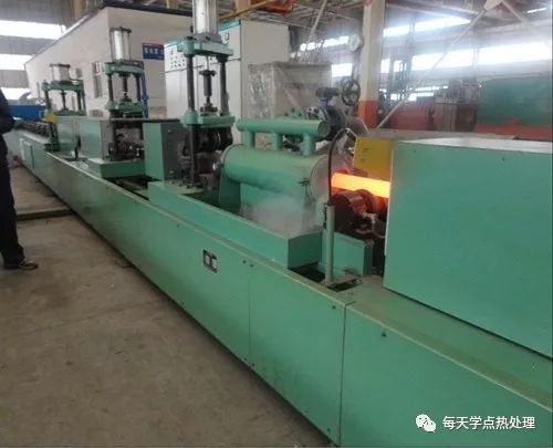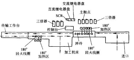 注:管材從右側(cè)進(jìn)入,加熱奧氏體化后經(jīng)過(guò)淬冷、輸出、回火。隨后被送到加工機(jī)床冷卻。
