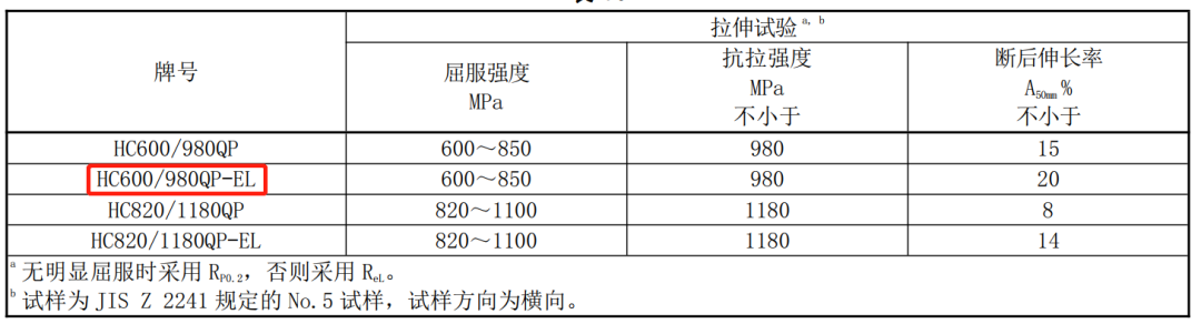 從上面性能看,其與現(xiàn)在國(guó)內(nèi)寶武的第三代先進(jìn)高強(qiáng)鋼HC600/980QP-EL有點(diǎn)相似,該牌號(hào)的標(biāo)準(zhǔn)性能要求如下表:
