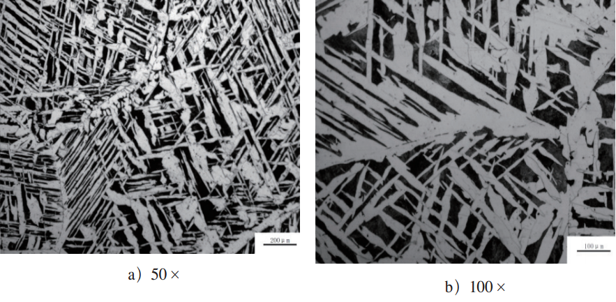 鑄鋼與鍛鋼相比,具有對產(chǎn)品結(jié)構(gòu)適應(yīng)性強(qiáng)、材料利用率高、價格低廉、加工周期短等優(yōu)點(diǎn),但鑄鋼鑄態(tài)組織晶粒粗大,有魏氏組織和成分偏析等很多不可避免的缺陷,對熱處理工序產(chǎn)生不利的影響。魏氏組織的存在使鑄鋼的塑性,特別是沖擊韌度下降,因此鑄鋼件需要在淬火前進(jìn)行熱處理以消除魏氏組織。組織晶粒粗大,容易在淬火時產(chǎn)生開裂,必須在淬火前進(jìn)行退火或正火處理,為細(xì)化晶粒和淬火作組織準(zhǔn)備。圖1為ZG50SiMn鋼直接調(diào)質(zhì),用4%硝酸酒精溶液腐蝕后的魏氏組織。