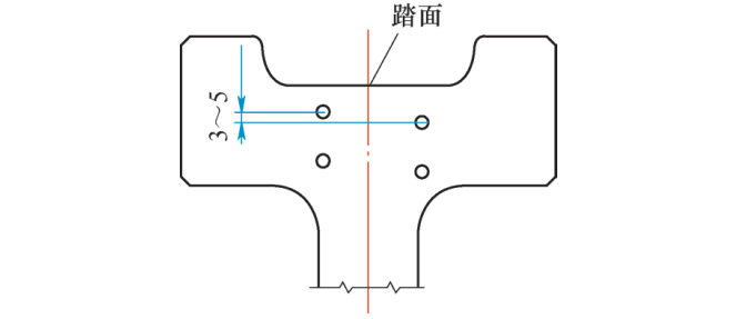 4)淬硬層深度的要求:測定淬硬層深度時,先將車輪切割開(用氣割時為了消除熱影響區(qū),加工余量至少為20mm),再加工成徑向剖面試樣。從踏面(見圖2)開始用硬度計沿徑向每隔3~5mm測1點(diǎn),測出硬度≥260HBW處的深度,即為淬硬層深度。