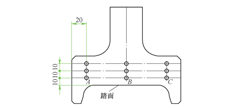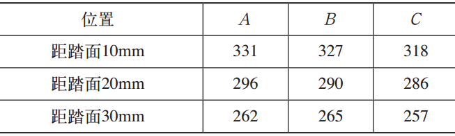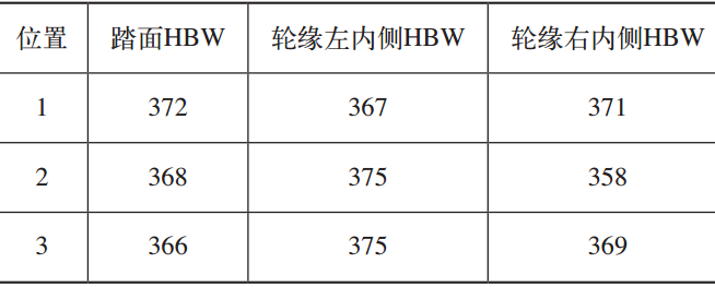 3)車輪踏面和輪緣內(nèi)側(cè)表面硬度:車輪踏面和輪緣內(nèi)側(cè)表面硬度檢驗(yàn)時,用硬度計在車輪踏面上沿圓周等分測3點(diǎn),其中2點(diǎn)硬度達(dá)到技術(shù)要求,即為合格。當(dāng)某檢測點(diǎn)的硬度值不符合要求時,沿該點(diǎn)的軸線方向加測2點(diǎn),如該2點(diǎn)硬度均達(dá)到技術(shù)要求即為合格。