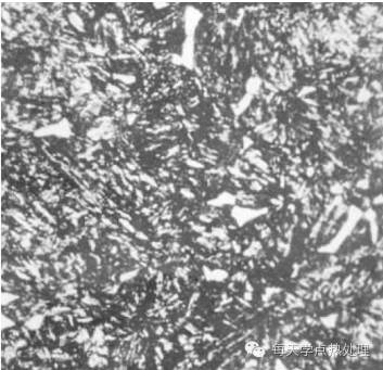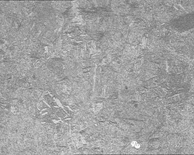 此件加熱溫度不足或保溫不夠?qū)е聣K狀鐵素體未完全奧氏體化,淬火后保持了塊狀鐵素體形態(tài)。這樣組織性能很難合格。調(diào)質(zhì)件避免出現(xiàn)此種組織形貌。此種組織多見(jiàn)于原材料中存在魏氏組織后淬火后形貌。