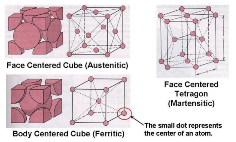 奧氏體(FCC)、鐵素體(BCC)和馬氏體(FCT)不銹鋼的分子結(jié)構(gòu)