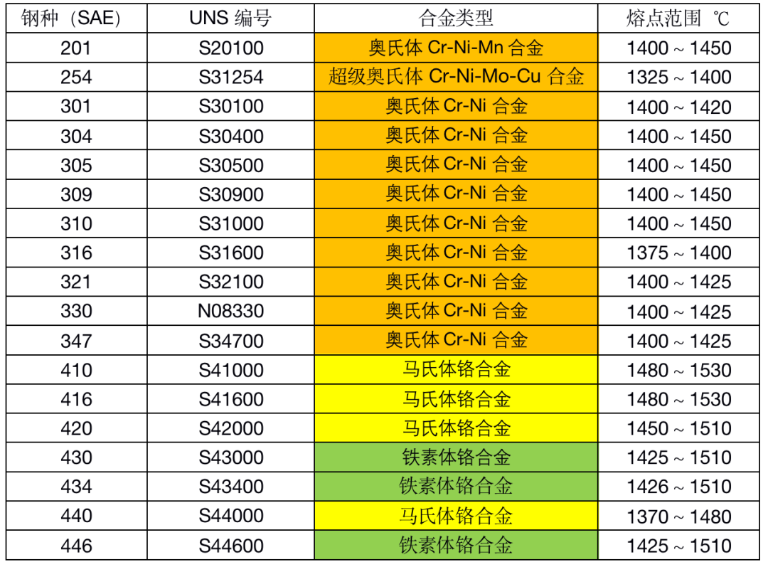 文末福利是常用不銹鋼的熔化溫度范圍表: