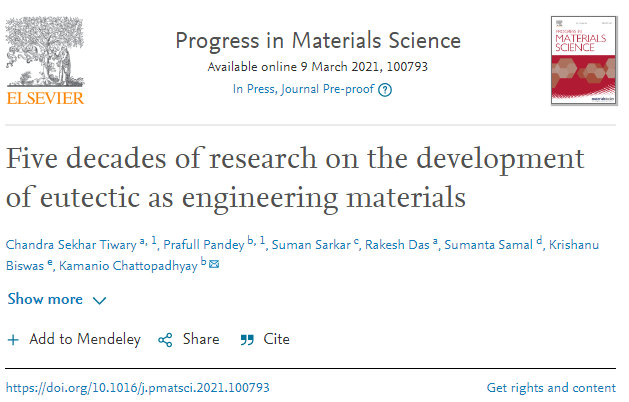 導(dǎo)讀:近日,印度理工學(xué)院Chandra Sekhar Tiwary教授團(tuán)隊(duì)在國(guó)際材料領(lǐng)域著名期刊Progress in Materials Science上發(fā)表了題為“Five decades of research on the development of eutectic as engineering materials”的頂刊綜述,IF=31.56該論文對(duì)共晶合金的發(fā)展進(jìn)行了回顧和展望,重點(diǎn)介紹了三元及高階多組分合金共晶凝固過(guò)程中出現(xiàn)的復(fù)雜組織。綜述了近年來(lái)高熵合金的研究進(jìn)展,以鋁、鈦、鎳、金屬間化合物等共晶合金為例,主要研究了共晶合金的顯微組織和力學(xué)性能。強(qiáng)調(diào)了超細(xì)共晶和多尺度長(zhǎng)度、尺度和形貌變化的可能性。它突出了未來(lái)這些合金作為工程應(yīng)用的高強(qiáng)度結(jié)構(gòu)材料出現(xiàn)的巨大潛力。