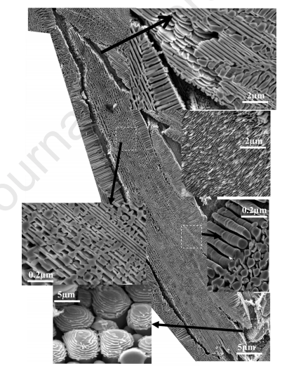 圖2 由不同形貌的共晶片組成的復(fù)雜共晶合金的電蝕SEM顯微圖。