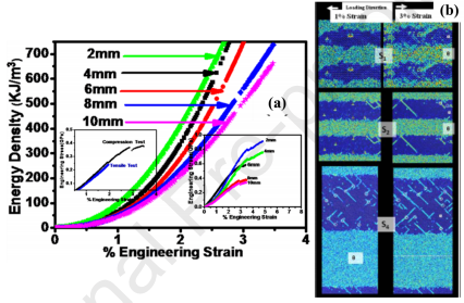 圖3 (a)不同片層間距下能量密度與百分比應(yīng)變的關(guān)系。插圖:在拉伸和壓縮試驗(yàn)中,不同片層間距的工程應(yīng)力與百分比應(yīng)變的實(shí)驗(yàn)圖。(b)分子動(dòng)力學(xué)(MD)快照模擬了I和3%應(yīng)變時(shí)3個(gè)層板間距(6、20和150 nm)