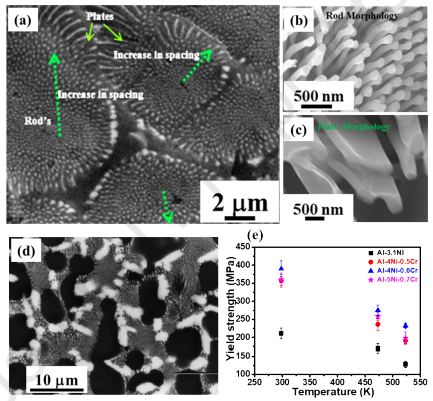 圖4 (a)吸力鑄造Al-4Ni-0.6Cr合金的背散射SEM圖像,顯示了從中心到集落邊界共晶空間增加的雙重形態(tài)。(b)和(c)使用TLD(通過(guò)透鏡)探測(cè)器的掃描電鏡圖像闡明了在共晶菌落和菌落邊界 中存在的雙形態(tài),即棒和板。(d)鑄態(tài)Al- 2ni - 2cr合金背散射電鏡顯微圖