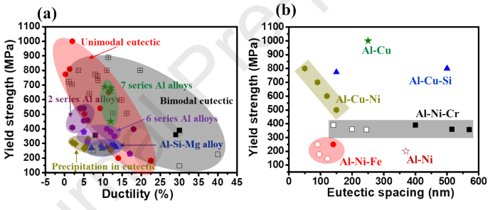 圖6 (a)各種開發(fā)的Al基合金屈服強(qiáng)度與延性曲線。(b)二元和三元Al基共晶的屈服強(qiáng)度與共晶間距圖。開放符號(hào)表示桿間距,而封閉符號(hào)表示片層間距。