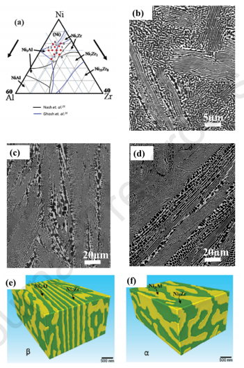 圖9 (a) Ni-Al-Zr三元體系的液相線投影。(b) Ni3Al-NisZr, (c)和(d) Ni,Al-NiZrz和NiAl-NijZrz共晶。(e)和(f) 3D圖像,尼薩爾-尼斯?fàn)?[14,201].